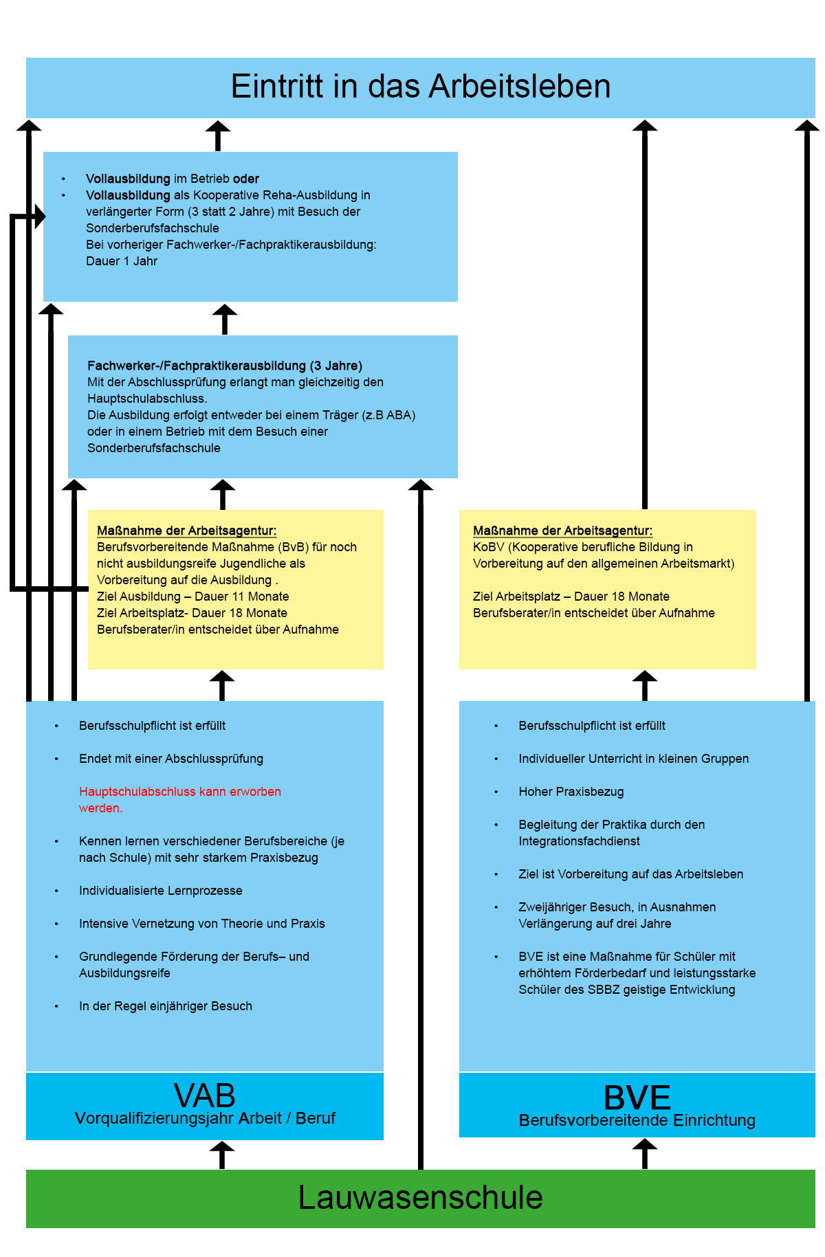 Die Schülerinnen und Schüler machen im Laufe der drei Jahre mehrere Praktika und können so möglichst viel praktische Berufserfahrung sammeln. Zusätzlich finden Betriebserkundungen und der Besuch von weiterführenden Schulen statt. Ein Berater der Agentur für Arbeit begleitet die Schülerinnen und Schüler ebenfalls.